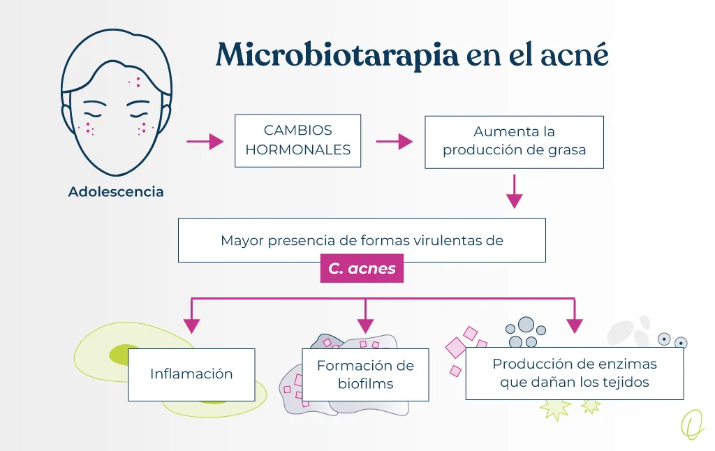 A nivel de la microbiota cutánea se describe un incremento en ciertas cepas virulentas de Cutibacterium acnes, que promueven la mayor producción de sebo, la obstrucción de poros (formación de comedones) y la inflamación de la piel. C. acnes logra esto mediante la producción de enzimas que dañan las células de la piel y la formación de biofilms, estructuras que le confieren resistencia a los tratamientos antibióticos.